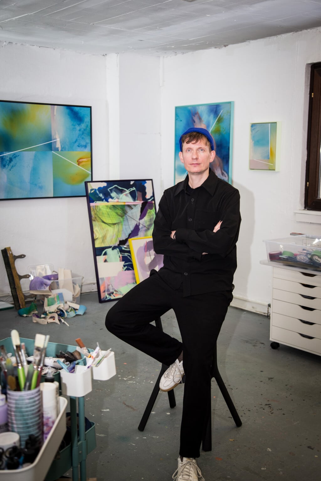 Rooted in painting, drawing, and urban mark-making, he develops visual systems that reference landscape, atmosphere, and architectural space in a reduced, non-representational way. His compositions balance control and openness, combining precise construction with intuitive gestures.