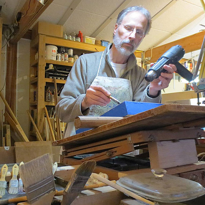 Missouri artist Keith Kavanaugh sees a connection between the spontaneity of jazz and the act of painting. Working in the ancient medium of encaustic, each landscape is an improvisation on his memory of a place in time. While they may look traditional at first glance, a closer inspection reveals the rich surface and translucent layers unique to melted beeswax. Influenced by the Tonalists, Kavanaugh works with a palette of muted colors to reconstruct the ambiguous memories of places he frequents.