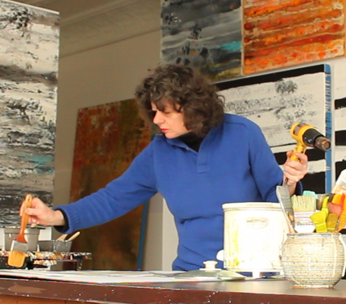 Lynn Basa likes to work large in all three areas of her art practice. She’s completed numerous public art commissions around the country in mosaic, glass, steel, terrazzo, and light. In her studio, she paints with an ancient medium called encaustic that is a mix of beeswax and oil pigment. She is the founder of The Corner Project, a community-development initiative to revive three blocks of the vintage, working-class main street where her storefront studio is located.