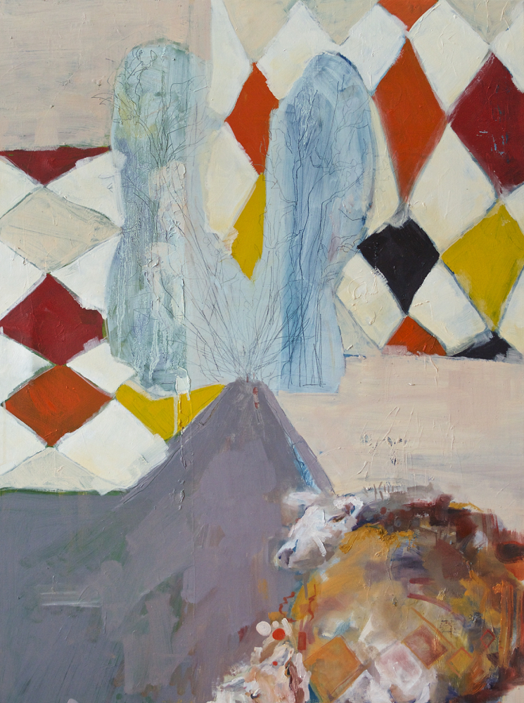 McConaghy explores the landscape through her own subjective view. Primarily, she works with oil paint on canvas, however a lengthly process of collage and drawing are first vigorously tested in order to create an image that she is content with. It is the beginning stage of every painting she creates and whilst the narrative is always related to the landscape, it is this subconscious process of collage that allows for her own made up reality of the landscape to unfold. Her work is emotionally influenced by her own subjective narrative and she creates her paintings to allow the viewer to question what is real, surreal or even possible. The work is aimed to encourage the audience to step into her own reality that she has created through this subconscious process, and to question traditional narratives surrounding the landscape. This concept of the subjective space and the objective place is explored throughout her work. The subjective space meaning an emotionally inspired concept, compared with the objective place as a physical representation. She often aims to join the two concepts through voided or claustrophobic situations.