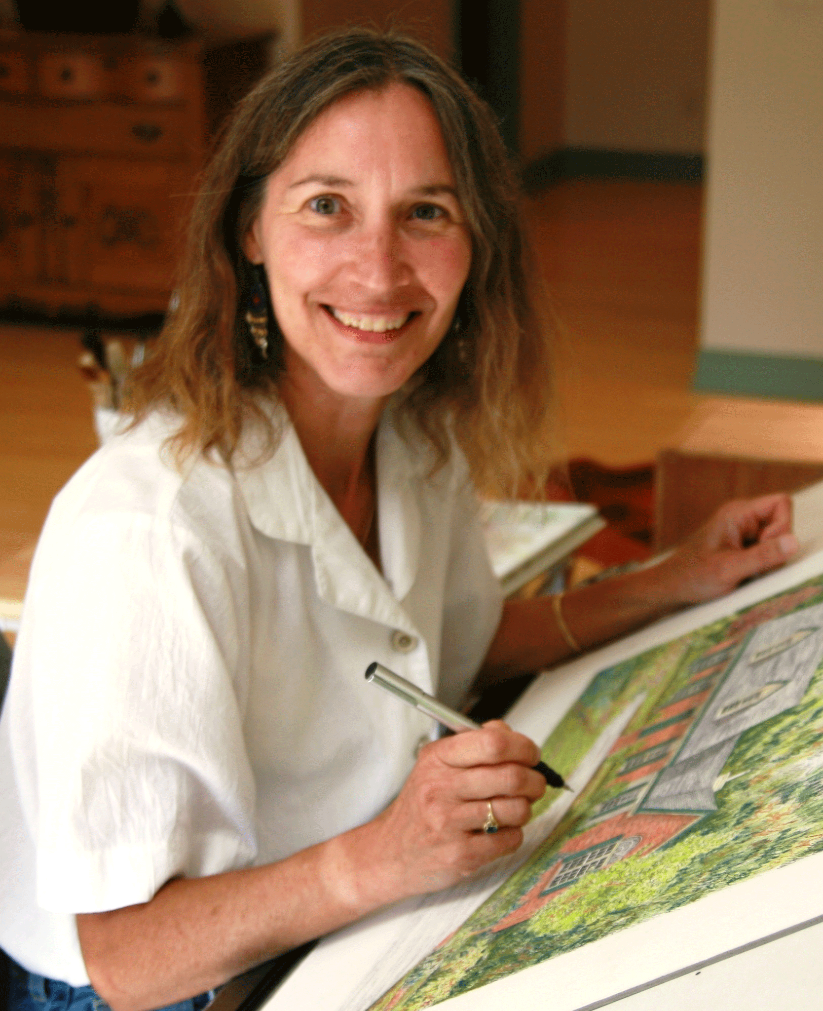 Ruth carries a camera wherever she goes to photograph ordinary sights and scenes around the US and then brings them back to uniquely reinterpret them in a wide variety of media, determined by how the subject matter speaks to her. In her studio, you might find architectural art, portraits, and landscape works done in pen and ink, pastel, watercolors and acrylics, usually in a realistic style.
