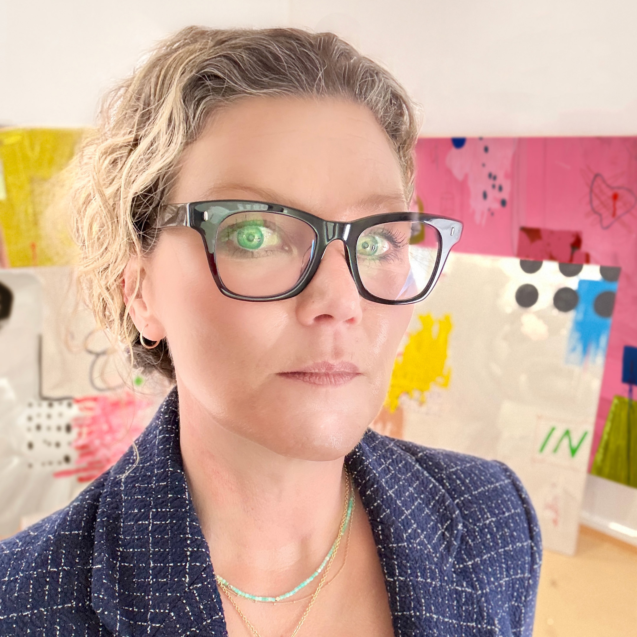Sarah Finucane is a contemporary abstract artist whose work blends structured design with raw, intuitive expression. Based in Connecticut after nearly two decades in LA, she brings a creative director’s clarity to a deeply personal practice. Her background in advertising and tech—leading campaigns for Fortune 50 brands—trained her to communicate through composition, balance, and tone. Those instincts now run through her artwork, where a visual language takes the place of literal messaging. Her art has been featured in Vogue and selected by Anthropologie’s curators. Collected internationally, her pieces often sell before they’re finished, and her commissions book out months in advance.