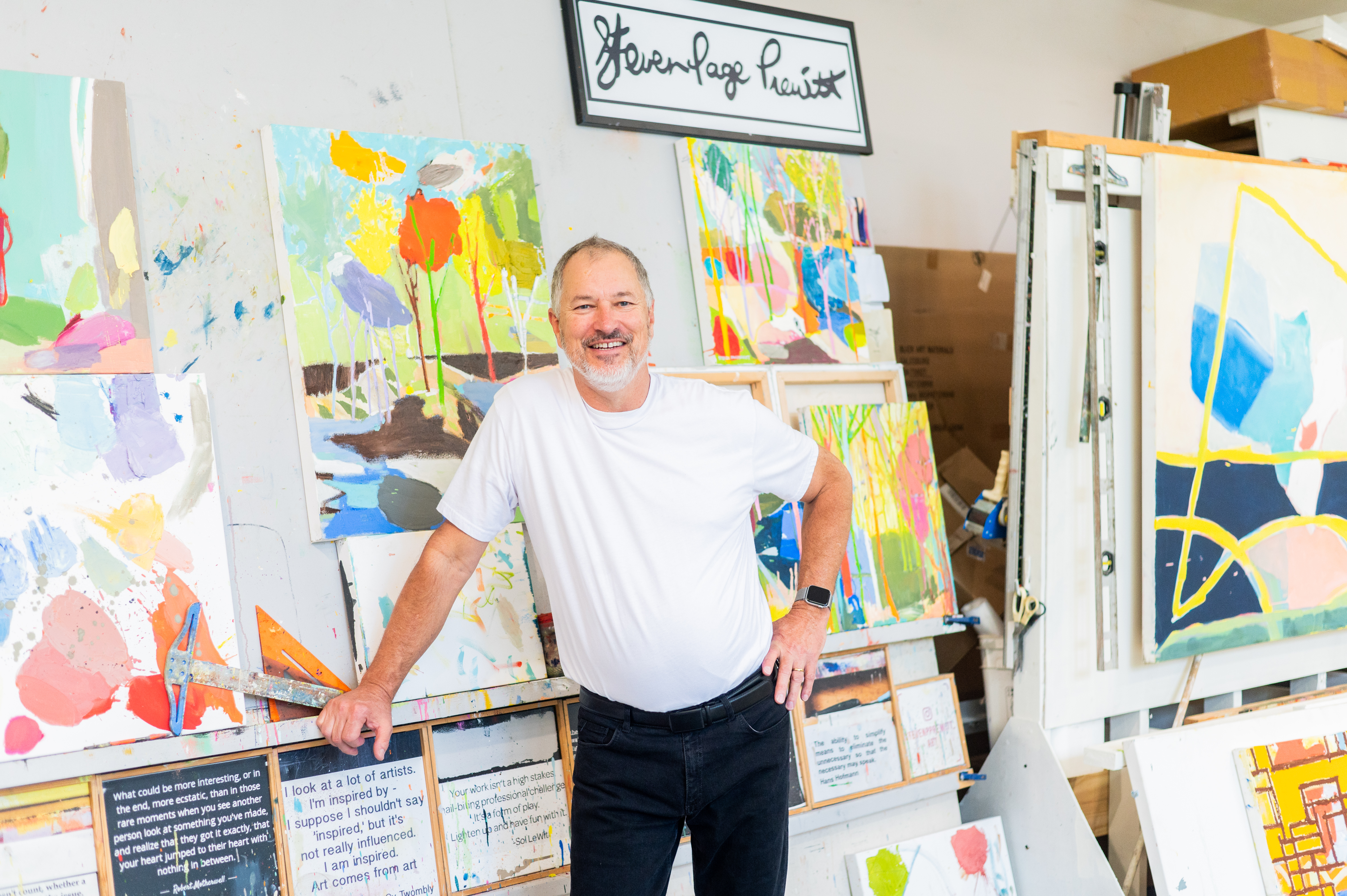 As Steven considered building his studio, he spent a lot of time looking at photos of other artists working and their ateliers. His favorites are Roy Lichenstein's and Willem de Kooning’s studios. Most of the inspiration behind his studio design and layout comes from photos of Willem de Kooning in his East Hampton NY studio. Both de Kooning’s and Steven’s have double-high windows, high ceilings, and white walls that bring in lots of natural light and atmosphere. De Kooning and Steven created ‘runways’ of several steps of walking distance for viewing work from afar. On each side of these ‘runways’ are tables with various painting supplies; he has bowls of mixed paint and boxes and boxes of unopened paint tubes at the ready. Steven’s easel is a 2×4 structure built into the main wall for holding his stretched canvases. Rolling racks hold large canvases out of the way of the working space. His space is expansive and cozy at the same time. It is filled with lots of light and surrounded by woods and mountains on all sides at the end of a quiet road in the Blue Ridge Mountains of North Carolina, USA.