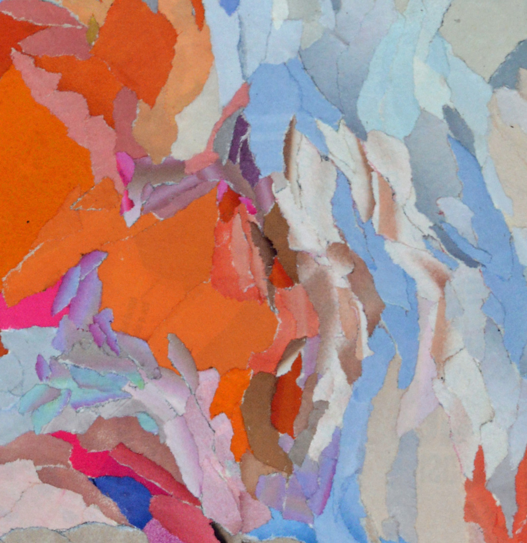 Oldham also creates unusual assembled works, acrylic paintings on paper which are torn and reassembled on hardboard, as an exploration depth, movement and texture on a two dimensional surface.
