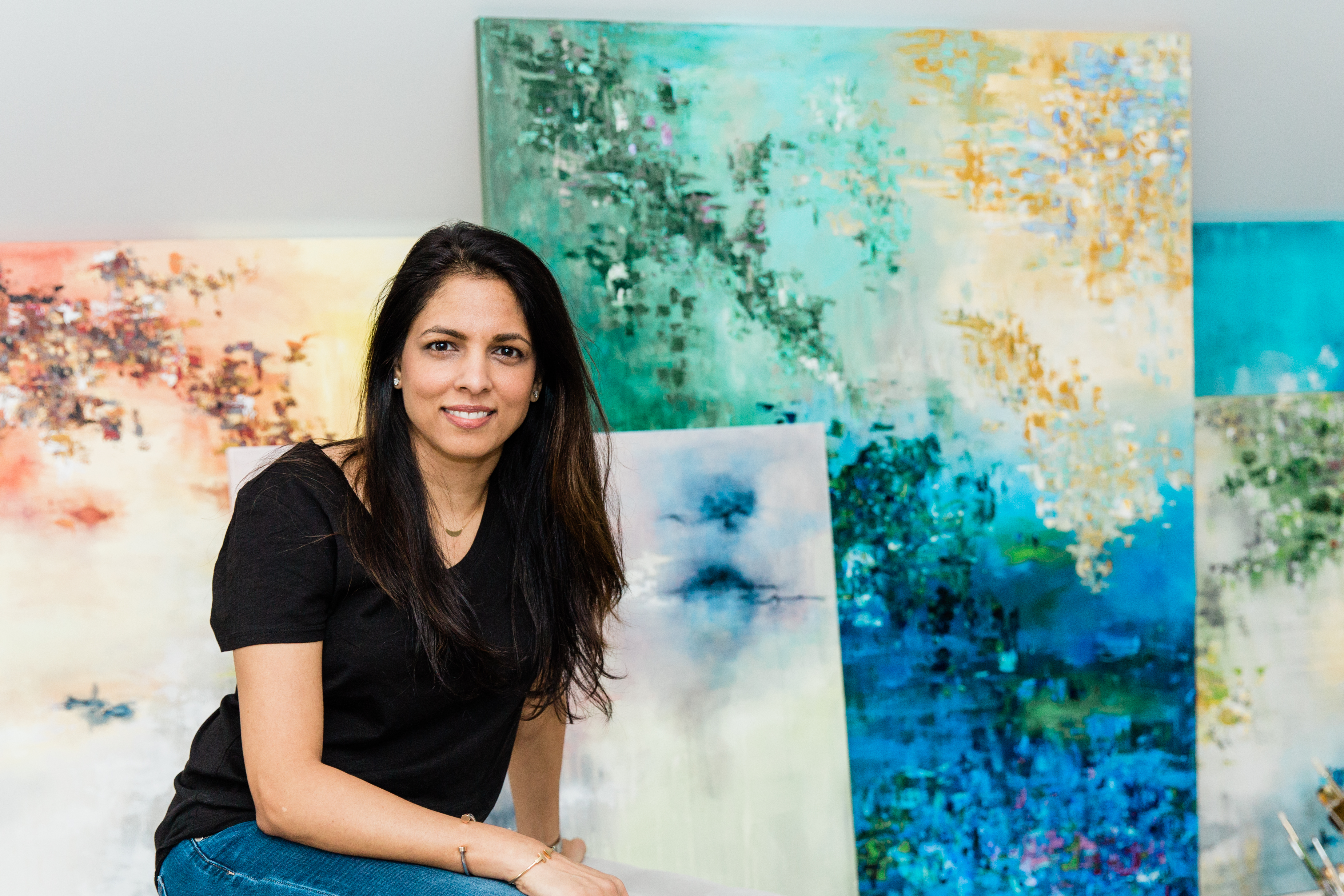 Her earliest memories are ones of her engineer/architect father often times bringing design work home. He would create beautiful buildings and structures while ensuring their detailed accuracy and she would sit alongside him with her colorful supplies trying to emulate him. He worked with a delicate balance between creativity grounded by practicality. It is this process and balance that she tries to carry into her art today. As an adult, a successful career as a pharmacist has also led her to utilize both sides of her brain which in turn helps balance the chaotic, vibrant world of abstract with an analytical and perceptive method. In the end, she hopes neither side overpowers the other in her artwork leaving enough room for its viewer to arrive at the vertex of familiarity and abstractionism.